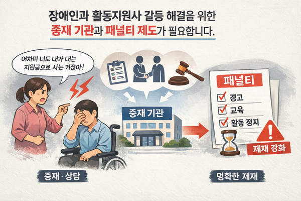 물론 모든 활동지원사가 그렇다는 것은 아니다. 대부분의 활동지원사는 책임감과 사명감을 가지고 장애인의 삶을 지원하고 있다. 그러나 일부 부적절한 사례가 발생할 때 이를 해결할 제도적 장치가 부족한 것도 현실이다. 현재 갈등이 발생하면 가장 일반적인 해결 방식은 활동지원사를 교체하는 것이다. 하지만 교체는 근본적인 해결책이 되기 어렵다. 장애인은 새로운 활동지원사를 다시 만나 관계를 형성해야 하는 부담을 겪게 되고, 활동지원사 역시 문제의 원인을 충분히 돌아볼 기회를 갖지 못한 채 현장을 떠나게 된다. 결국 갈등은 개인 간의 문제로만 처리되고, 구조적인 개선은 이루어지지 않는다.