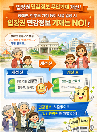 먼저 전국 관광지나 시설의 무료·감면 입장권 및 탑승권에 일반권과 차별되는 표기가 일괄 삭제된다. 일부 무료 입장권에 '장애인', '임산부' 등이 표기돼 이용자에게 심리적 위축감을 준다는 지적을 반영한 조치로, 향후 무료·감면 입장권에 일반권과 다른 표기나 색상 구분을 하지 않도록 즉각 점검에 나서기로 했다.